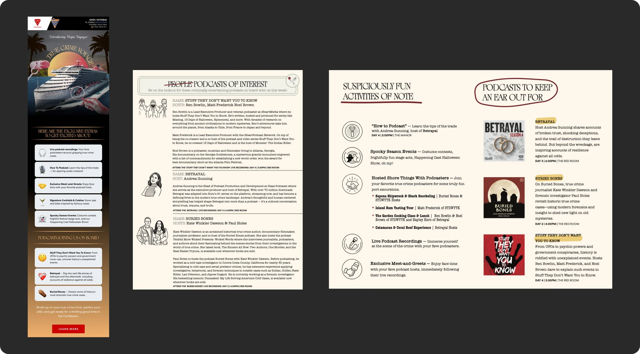 A limited sailing concept born from a partnership between Virgin Voyages and iHeartPodcasts. The creative had to feel genuinely dark and immersive — not campy — while holding the elevated world of the VV brand. I directed assets across campaign and onboard experience, built around cult-status shows Betrayal, Buried Bones, and Stuff They Don't Want You to Know.